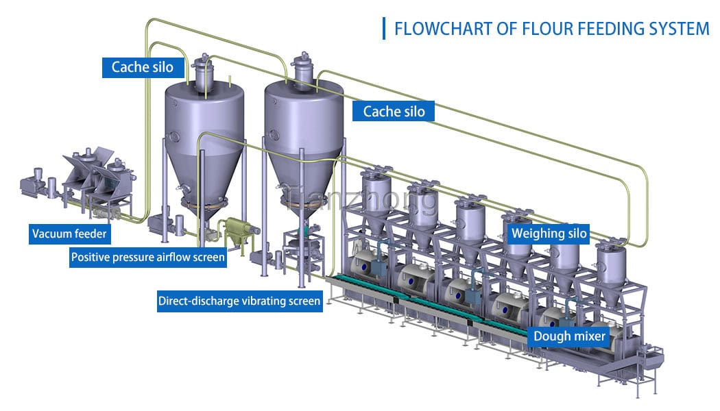 Fully automated flour feeding solution, specially designed for modern food processing plants, providing efficient and precise flour transportation and measurement.The flour feeding system is a core component of food processing production lines, responsible for accurately transporting flour from storage silos to mixing equipment. The system uses advanced pneumatic conveying and precision weighing technology to ensure continuous and accurate flour supply.