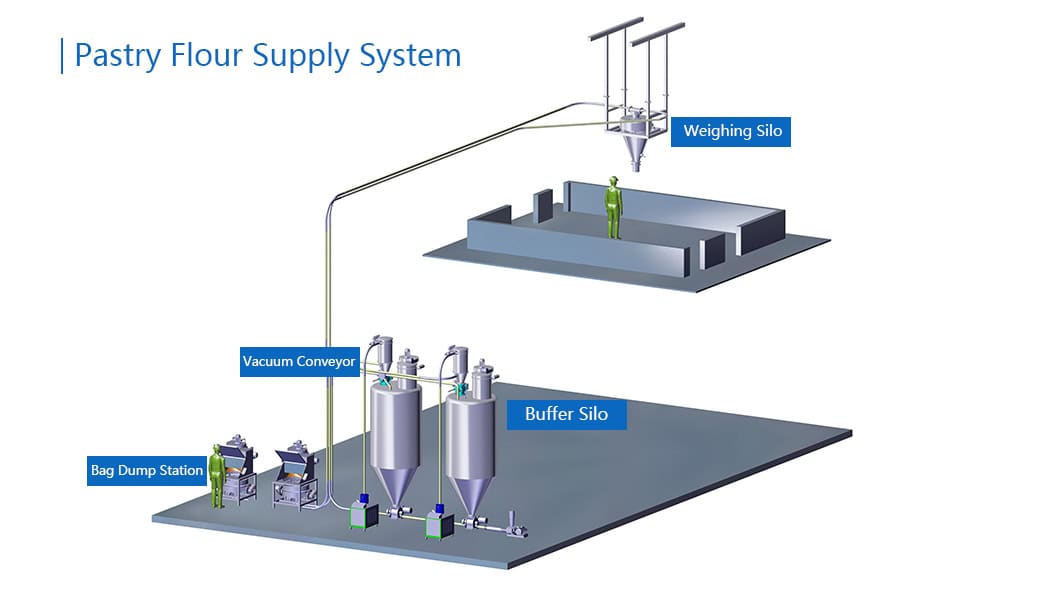 Fully automated flour supply solution, specially designed for modern pastry and bakery processing plants, providing efficient and precise flour transportation and measurement. The System is a core component of food processing production lines, responsible for accurately transporting flour from storage or bag dump stations to mixing equipment. The system uses advanced vacuum conveying and precision weighing technology to ensure continuous and accurate flour supply.