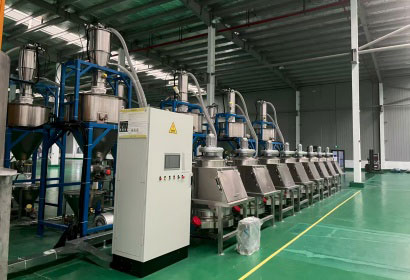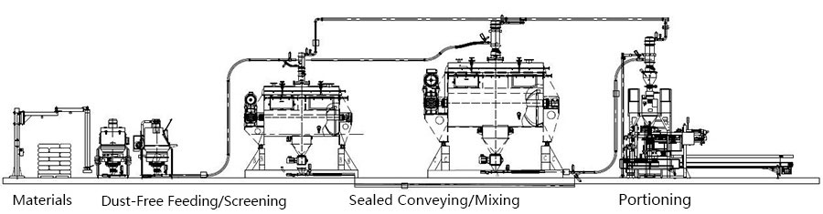 The system covers the complete workflow from raw material feeding, dust-free screening, sealed pneumatic conveying, continuous or batch mixing,